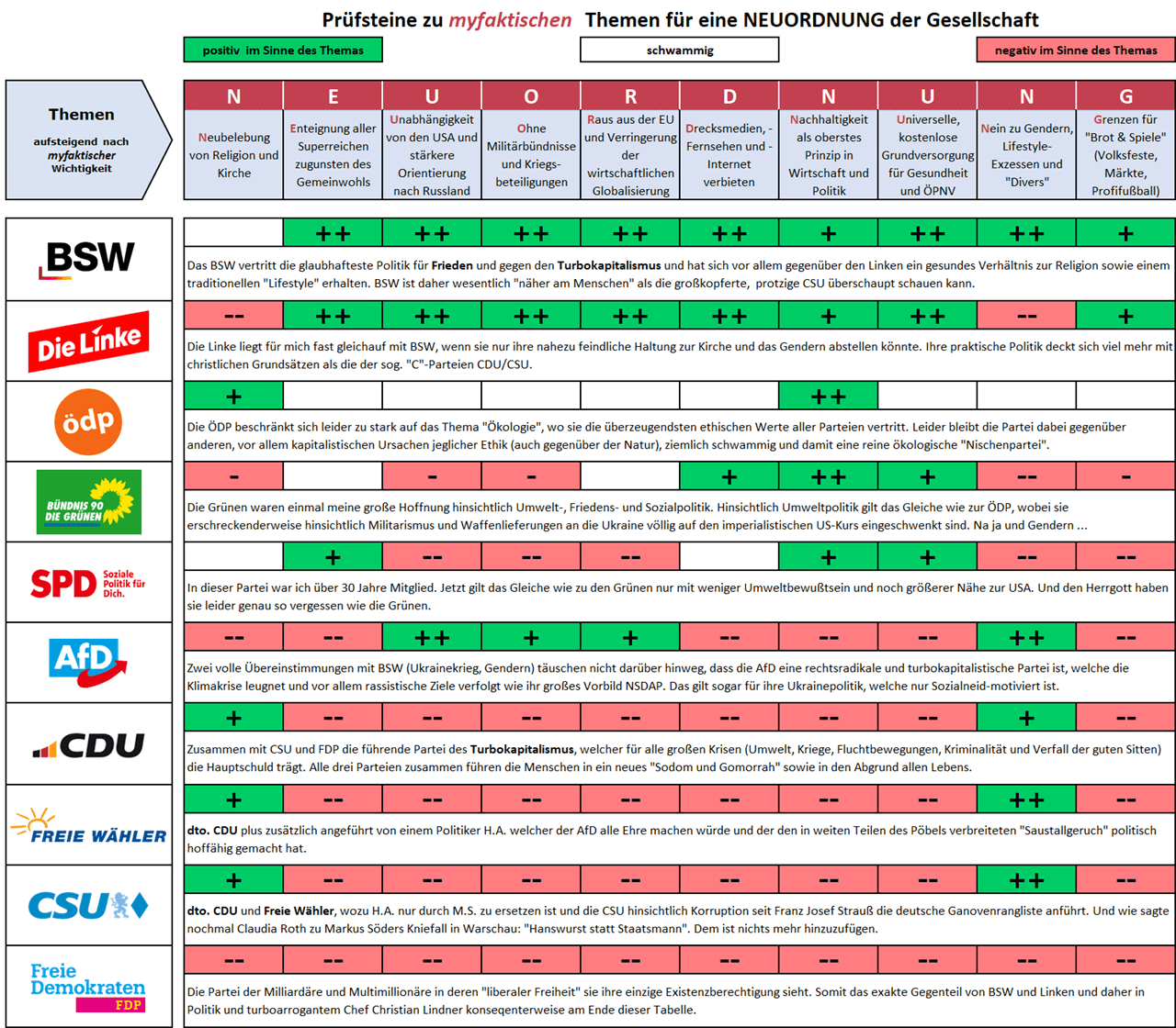 Aus meiner Weltsicht ist daher mit dem alles überragenden Teufelsthema Kapitalismus schon das wichtigste Kriterium zur Beurteilung aller nachrangigen Themen und Probleme benannt. Ich konzentriere mich im weiteren Verlauf daher hauptsächlich auf Deutschland und Europa. Dazu nenne ich zunächst die aus myfaktischer Sicht wichtigsten 10 Themen und Forderungen zur NEUORDNUNG der Gesellschaft und stelle dazu die wichtigsten Akteure aus Kirchen, Politik (Parteien), Wirtschaft, Medien, Sport und Kultur auf den Prüfstand.